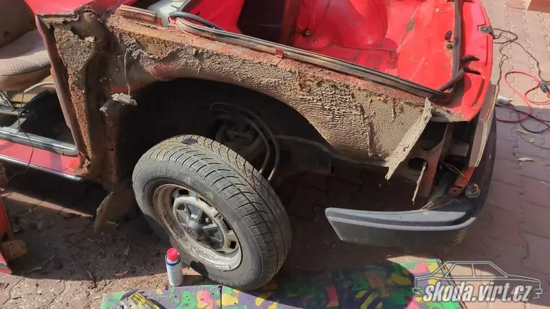 Jedná se o Škodu Rapid 120 ze srpna roku 1986, vyrobené v BAZu. Po koupi vozidla jsme udělali základní servis ( oleje, kapaliny, brzdové destičky atd.) a v létě nás čekala amatérská výměna předních blatníků, čela a rozleštění zašlého laku. To jsme stihli dokončit akorát na sraz do Poděbrad, který byl moc hezký.